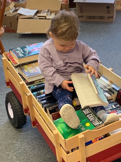 - YOUNG CUSTOMER SITTING IN OUR LITTLE RED WAGON FILLED WITH NEW BOOKS FOR CHILDREN UP TO 8 YEARS OF AGE.